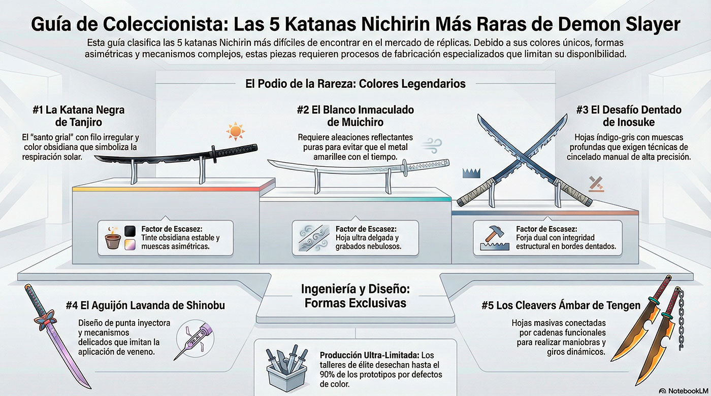 El podio culmina con la katana blanca de Muichiro Tokito en segundo lugar y la espada Nichirin negra de Tanjiro en primer, las katanas más difíciles de encontrar guardianes de la noche. Estos nichirin colores raros representan extremos históricos en el universo de Guardianes de la Noche: el blanco puro del Pilar de la Niebla evoca brumas etéreas y técnicas evasivas ultrarrápidas, mientras el negro misterioso de Tanjiro se vincula al legendario Aliento del Sol, olvidado por siglos.