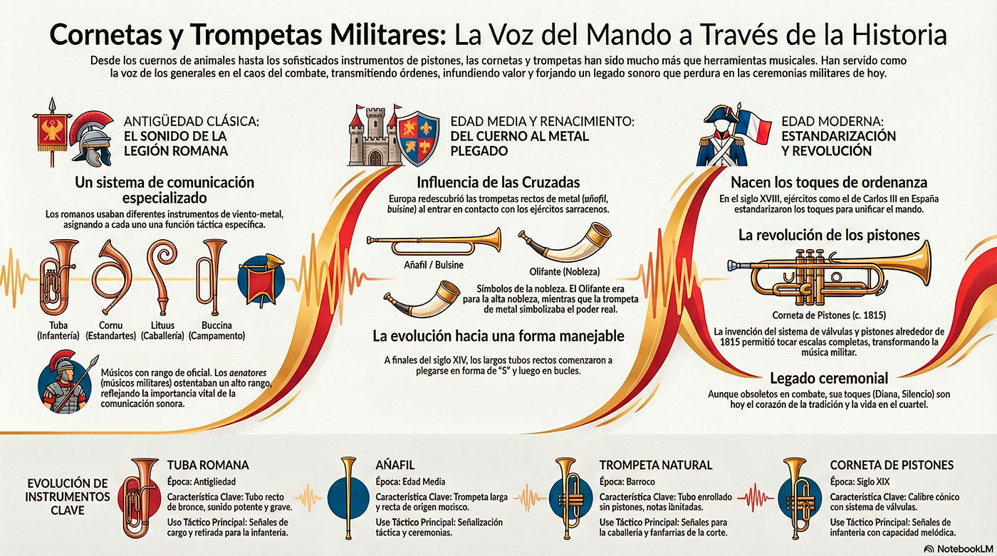 De señales a fanfarrias: evolución histórica de cornetas y trompetas militares